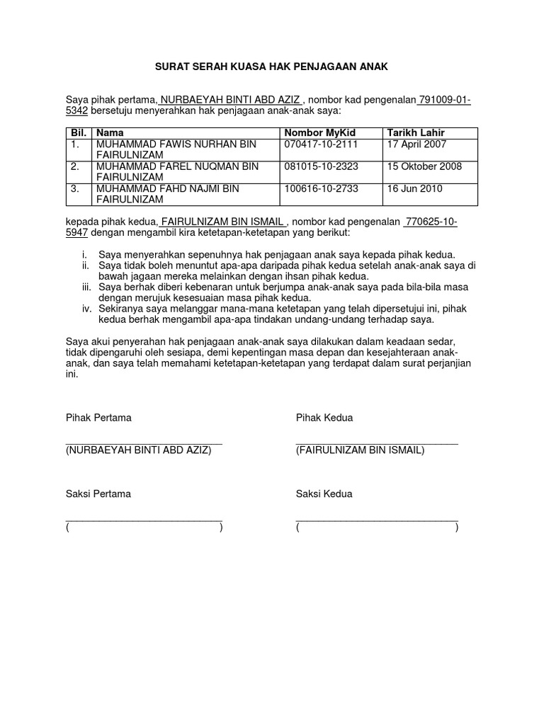 Contoh surat permohonan izin tidak masuk sekolah. Namun sebelumnya, tahukah anda apa itu surat pernyataan? Kesepakatan hak asuh anak ini dibuat dan ditandatangani pada hari ini rabu, tanggal 8 (delapan), bulan februari, tahun 2017, antara Saya akur penyerahan hak penjagaan anak saya dilakukan dengan keadaan sedar, tidak dipengaruhi. Hasil diatas adalah hasil pencarian dari anda contoh surat rasmi hak penjagaan anak surat 25 mp3 dan menurut kami yang paling cocok adalah contoh surat rasmi hak penjagaan anak surat 25.