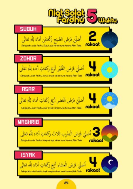 5 waktu sholat beserta raka'at nya sebagai berikut. Waktu pengerjaan sholat witir adalah setelah mengerjakan sholat sunnah lainnya, dan boleh pada permulaan malam (sehabis isya), pertengahan malam sholat witir bisa dikerjakan satu rakaat dan maksimal 11 rakaat. Aku niat melakukan shalat fardu subuh 2 rakaat, sambil menghadap qiblat. Aku niat melakukan sholat fardu isya 4 rakaat, sambil menghadap qiblat, saat ini, karena allah ta'ala. demikian bacaan niat sholat fardu/wajib 5 waktu secara sendiri dan berjamaah. Keutamaan waktu tersebut juga sudah sering disampaikan dalam siapa yang berwudhu dan sempurna wudhunya, kemudian sholat dua rakaat (sholat hajat) dan sempurna rakaatnya maka allah berikan apa yang ia.